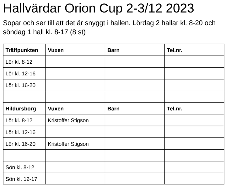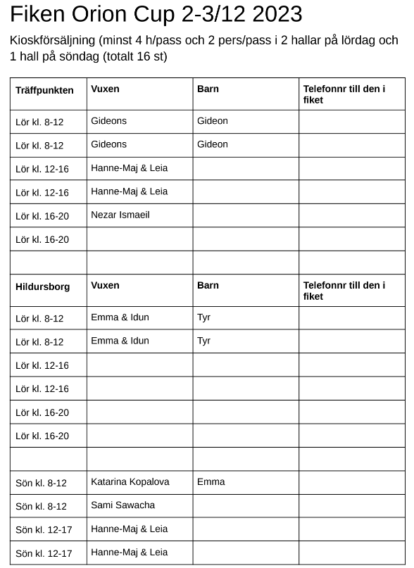 Jag har sammanställt listorna över passen vid Orion Cup 2-3/12 2023 och jag har lagt till två kolumner. Vi behöver både veta namnet på den som står i fiket eller är hallvärd, barnet/spelarens namn och även telefonnumret till den som tar något/några pass för att vi ska kunna kontakta personen om det skulle vara nåt.
